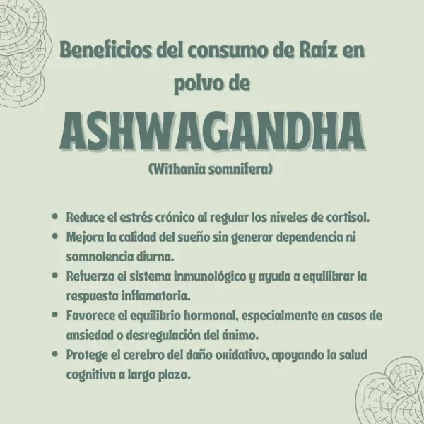 Originaria de la medicina ayurvédica, la Ashwagandha es un adaptógeno natural que ayuda al cuerpo a adaptarse al estrés físico y emocional.