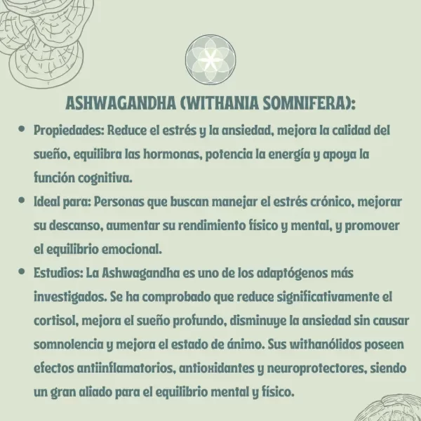 Uno de los adaptógenos más estudiados y utilizados en la medicina ayurvédica, conocida por su capacidad para restaurar el equilibrio del cuerpo y la mente.