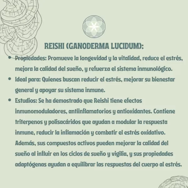 Reduce la inflamación: Los triterpenos del Reishi tienen propiedades antiinflamatorias que ayudan a aliviar dolores y mejorar la salud en general.