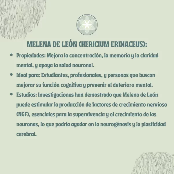 Melena de León: Utilizado por los monjes budistas desde tiempos antiguos para mejorar la concentración y la claridad mental. La ciencia actual respalda sus beneficios para la salud neurológica y digestiva.