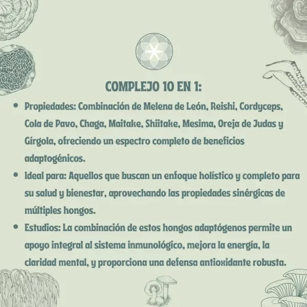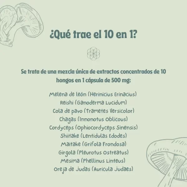 Contiene Extractos concentrado de Melena de león (Herinicius Erinacius), Reishi (Ganoderma Lucidum), Cola de pavo (Trametes Versicolor), Chagas (Innonotus Oblicous), Cordyceps (Ophiocordyceps Sinensis), Shiitake (Lentidulas Edodes), Maitake (Grifola Frondosa), Girgola (Pleurotus Ostreatus), Mesima (Phellinus Linteus) y Oreja de Judas (Auricula Judaes)