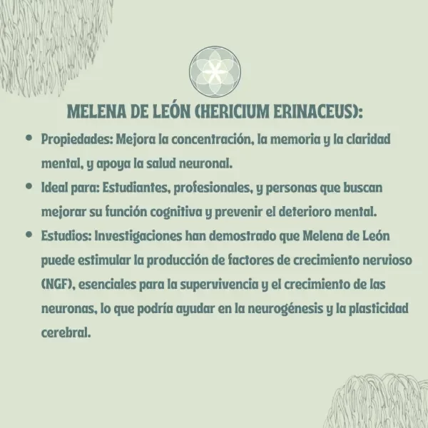 La melena de león es conocida por estimular el crecimiento y regeneración de las células nerviosas, lo que te ayudará a mantener niveles óptimos de energía y vitalidad.