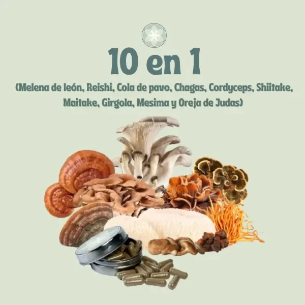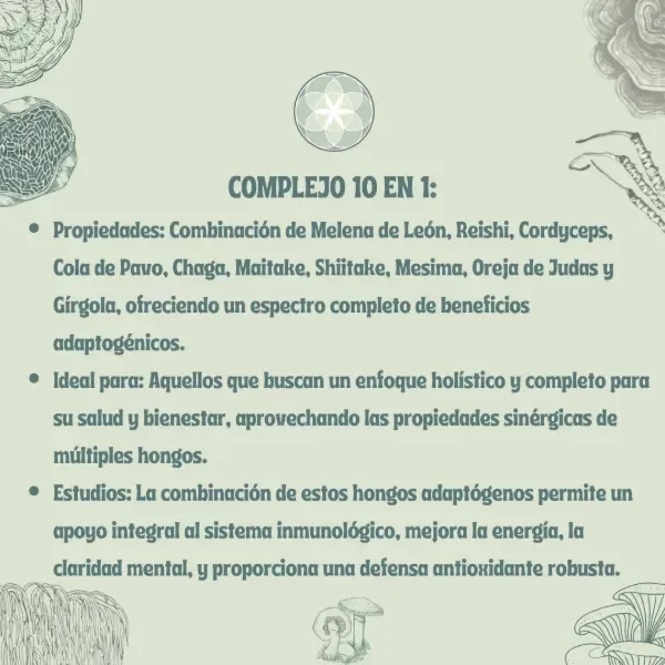 Contiene Extractos concentrado de Melena de león (Herinicius Erinacius), Reishi (Ganoderma Lucidum), Cola de pavo (Trametes Versicolor), Chagas (Innonotus Oblicous), Cordyceps (Ophiocordyceps Sinensis), Shiitake (Lentidulas Edodes), Maitake (Grifola Frondosa), Girgola (Pleurotus Ostreatus), Mesima (Phellinus Linteus) y Oreja de Judas (Auricula Judaes)