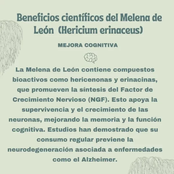 La melena de león es conocida por estimular el crecimiento y regeneración de las células nerviosas, lo que te ayudará a mantener niveles óptimos de energía y vitalidad.